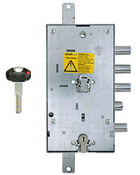Serratura composta da due sistemi di chiusura che interagiscono tra di loro; entrambi con chiave a cilindro. Il primo aziona tre chiavistelli di sicurezza ed adotta un sistema di protezione antitrapano, il secondo aziona un chiavistello e blocca la funzionalità del primo, per una sicurezza doppia.